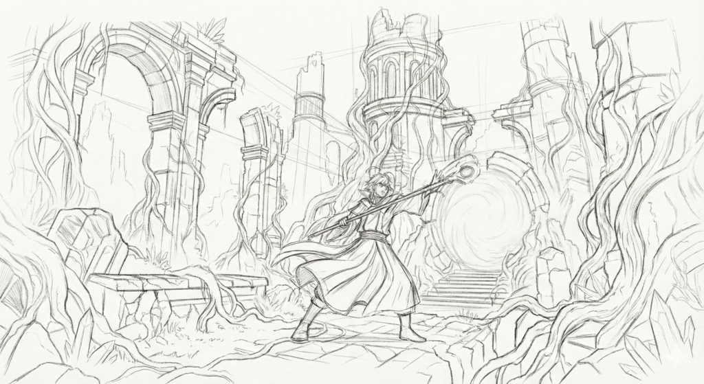 - Character Blocking: We define the “Key Poses” and silhouette placement early to ensure the character never gets lost in the background geometry.